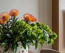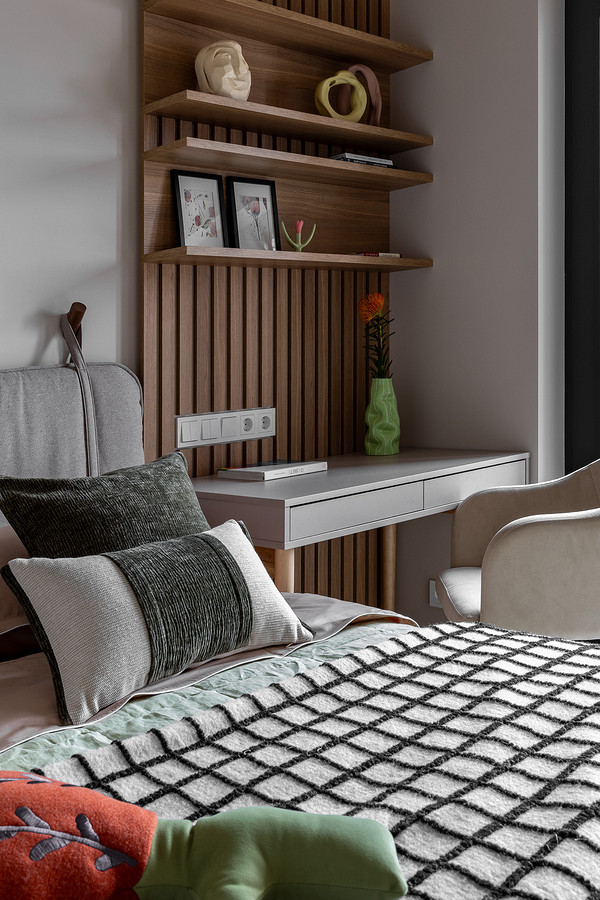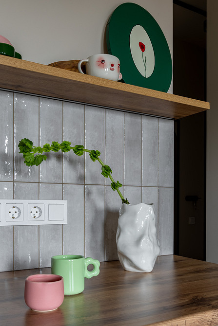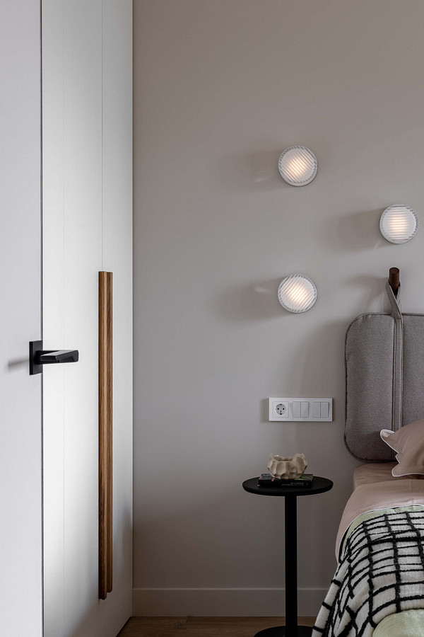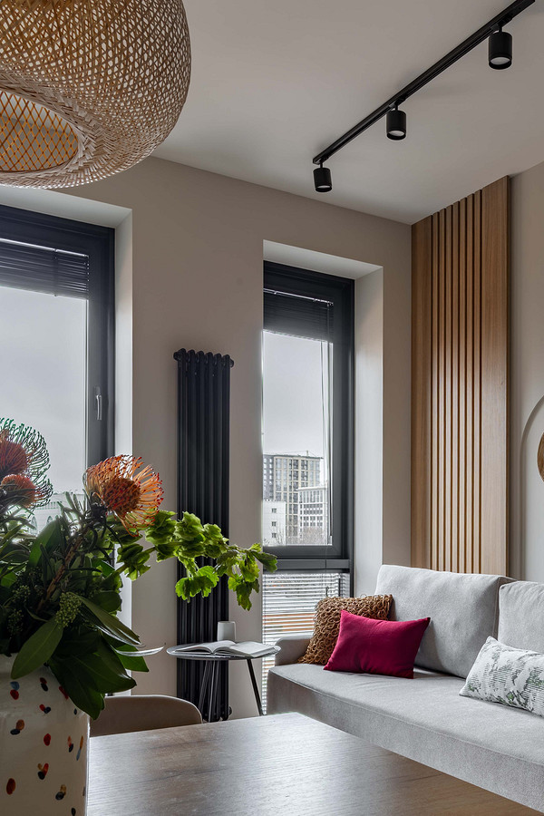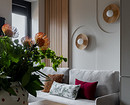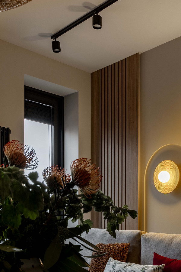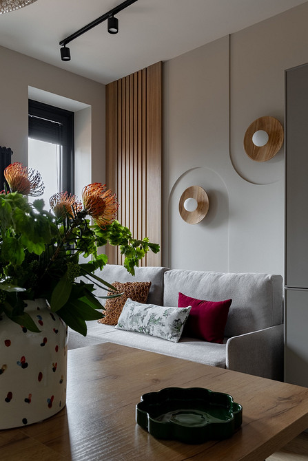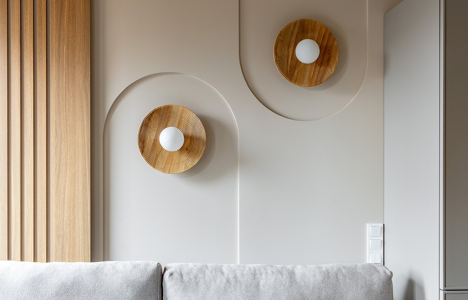 Концепцию интерьера дизайнер описывает как современную с нотками джапанди и ваби-саби. В такой концепции стены, как правило, делают фактурными, но заказчики настояли на гладких окрашенных поверхностях — в итоге для стен выбрали светлую серо-бежевую краску. Для акцентов использовали настенные панели под дерево — в углу за диваном, в ТВ-зоне, в спальне на стене с рабочим столом. Также дизайнер решила сделать объемные вырезы на стене за диваном — и разместить в них бра. Объемы и фактура дерева добавила пространству динамики.