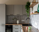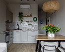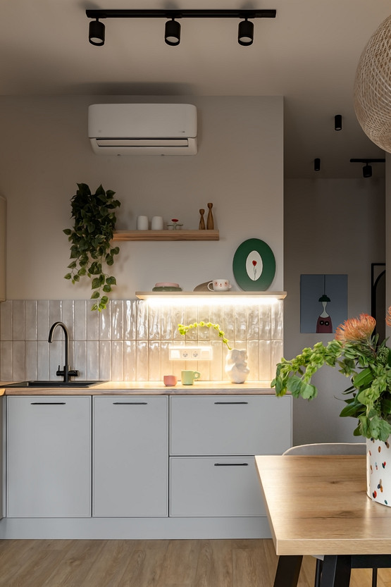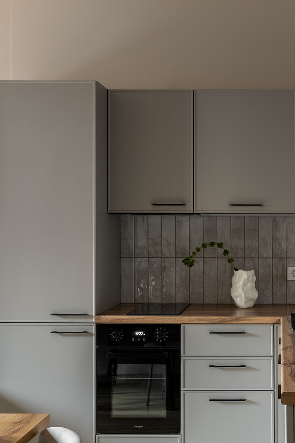 Кухонный гарнитур изготовили с фасадами в цвете, приближенном к цвету стен. В целях экономии не стали делать высокие шкафы до потолка и сократили их количество — часть шкафов заменили открытыми полками с подсветкой. Из техники: встроенный холодильник, узкий духовой шкаф и посудомоечная машина.