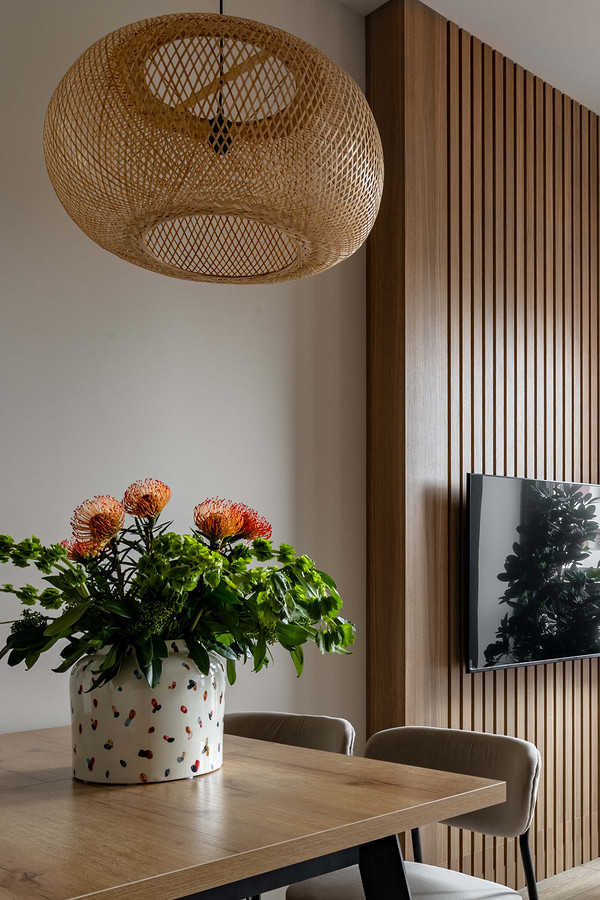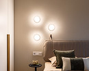 Сценарии света продумали так, чтобы можно было варьировать количество света: трековые светильники на потолке в качестве основного сценария и множество дополнительных источников освещения. В кухне-гостиной — подвесной светильник с плетеным абажуром над обеденным столом, подсветка полок на кухне, бра над диваном и скрытая подсветка за панелями. В спальне — композиция из бра рядом с кроватью и скрытая подсветка за рейками, эти сценарии можно включить отдельно.