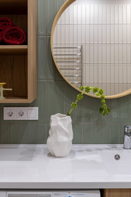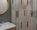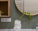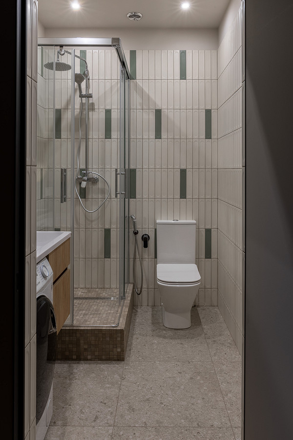 В ванной комнате скомбинировали плитку из одной коллекции, но разных оттенков: светлый бежевый и нежно-зеленый. На пол уложили керамогранит, а душевой поддон оформили мозаикой. Чтобы вписаться в бюджет, поддон выполнили под стандартный размер стеклянного ограждения — это позволило купить готовое, а не делать его на заказ.