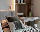 Кровать — двуспальная, но с ней дизайнер проявила изобретательность. «Я сразу планировала кровать в спальне без изголовья, потому что проход к рабочему месту мне хотелось оставить максимальным. А за счет изголовья мы сэкономили сантиметров 15-20 точно. Но само изголовье надо было смонтировать на стену. Если честно, я сбилась с ног, пока нашла нужное изголовье — именно такое, как планировала. По сути, это мягкая подушка, которая просто вешается на стену на специальные крепежи. Оказалось, что такие изголовья большая редкость, да еще и в нашем бюджете», — рассказывает Ирина.
