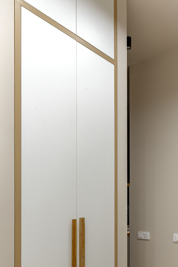 Корпусную мебель изготовили на заказ, для оптимизации бюджета выбрали в качестве материала фасадов ЛДСП в белом цвете. В прихожей сразу у входа встроен шкаф для одежды, в нем же предусмотрели место для зарядки робота-пылесоса и секцию для стремянки.