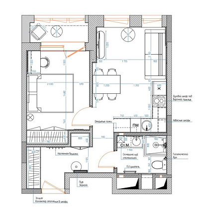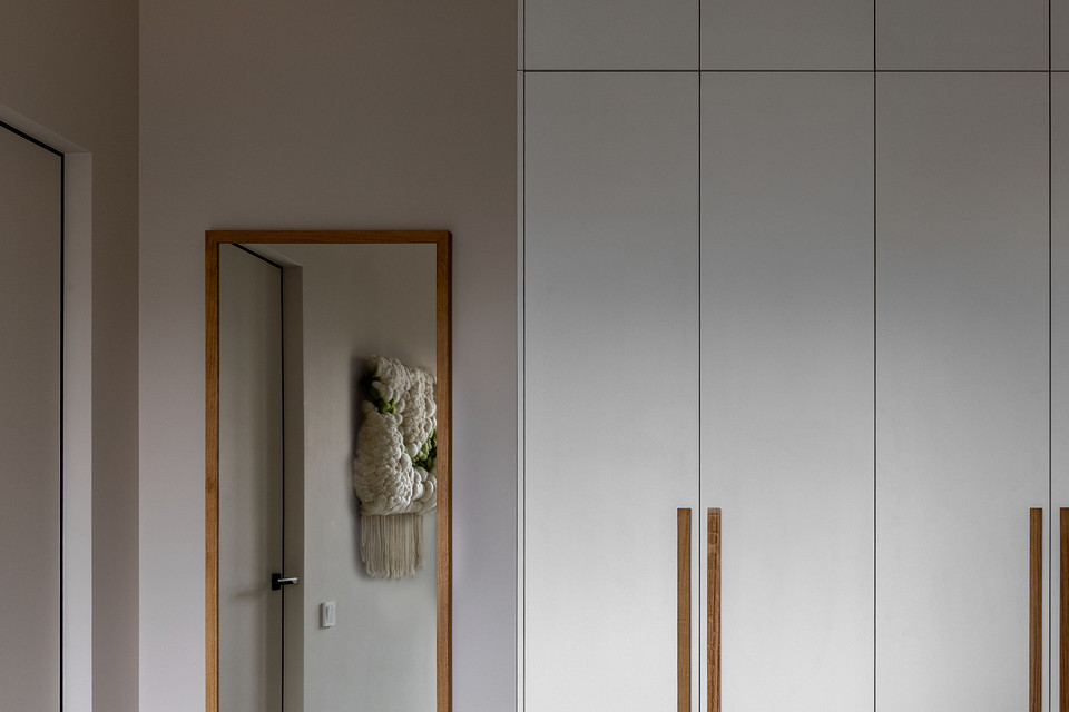 В изначальной планировке от застройщика перегородками была отделена только ванная комната. Сохранив «мокрые» зоны на своих местах, дизайнер предложила перепланировку, чтобы вписать как можно больше встроенных систем хранения. Так, вход в спальню сделали из кухни-гостиной. В прихожей создали ниши для встройки двух шкафов, в спальне тоже получилась ниша для шкафа.