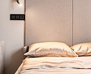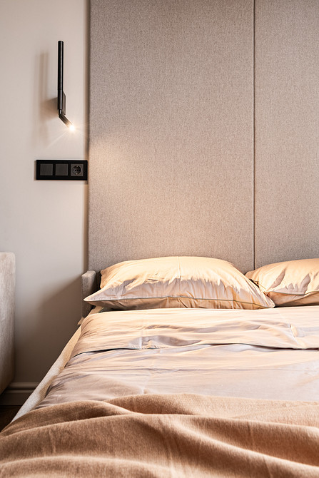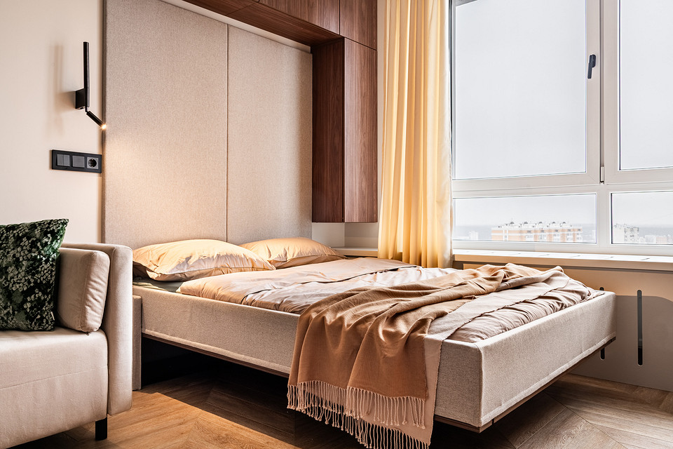 В комнате для повседневных вещей также стоит комод. В конструкции шкафа-кровати предусмотрены полки для хранения. Трансформер позволяет легко опустить спальное место и так же его поднять. Настенные панели за кроватью создают уют, а торец шкафчиков отделан той же тканью, что и панели.