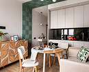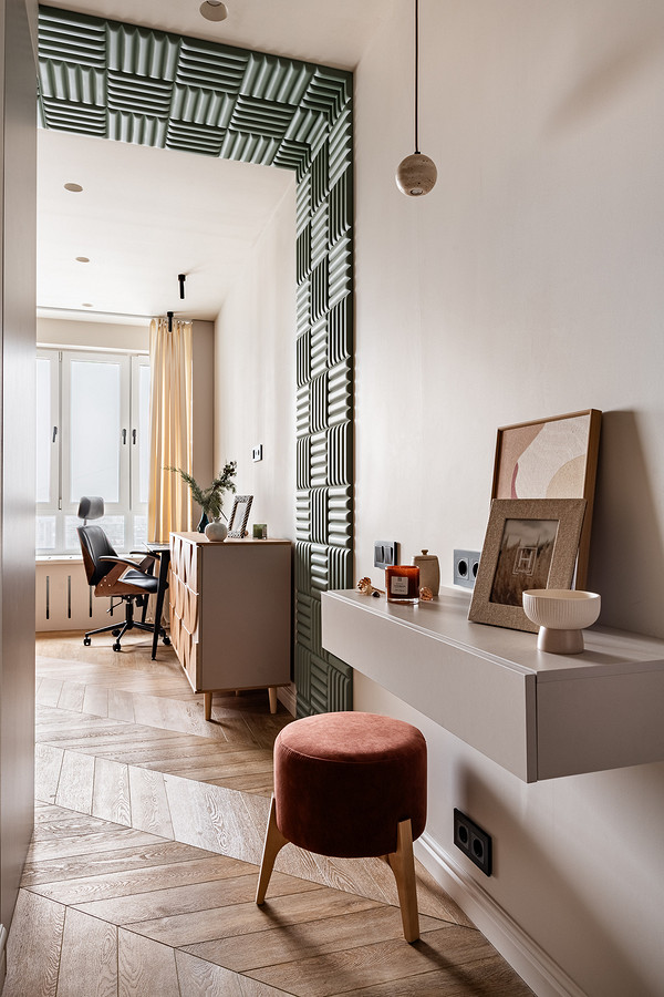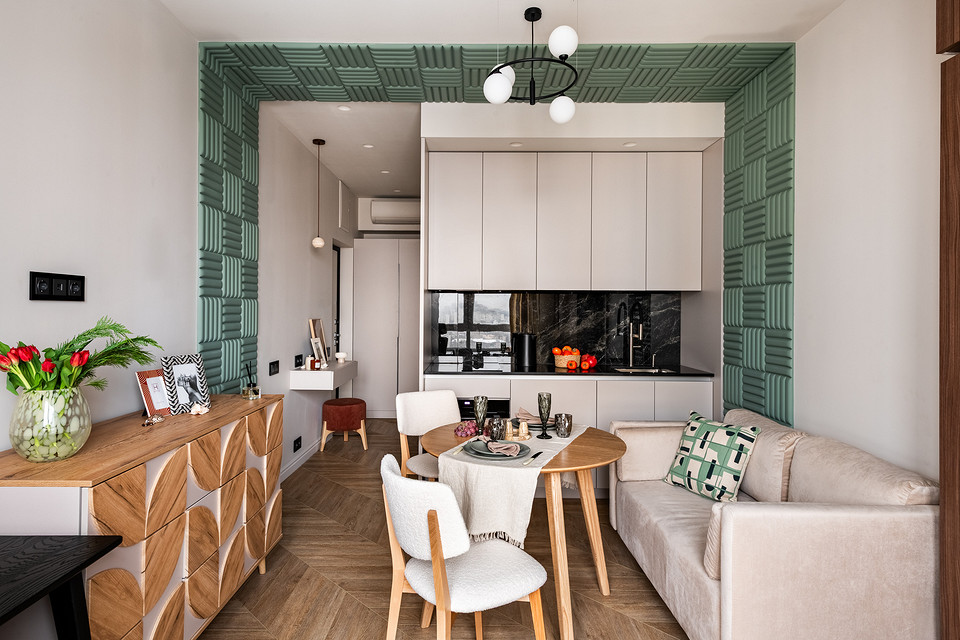 Для оформления стен и потолка выбрали одинаковую светлую краску. На пол по всей площади уложили диагональной «елочкой» кварцвинил под дерево. Акцентом в комнате стали объемные панели, напоминающие подушки. Их покрасили в приглушенный зеленый цвет. Панели на стене и потолке стали еще и элементом зонирования: кухню, прихожую и ванную они отделяют от «жилой» зоны с гостиной и спальней.