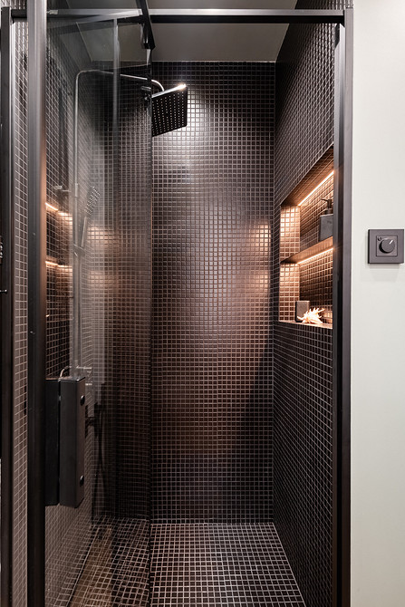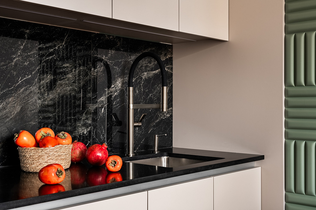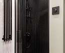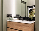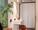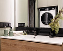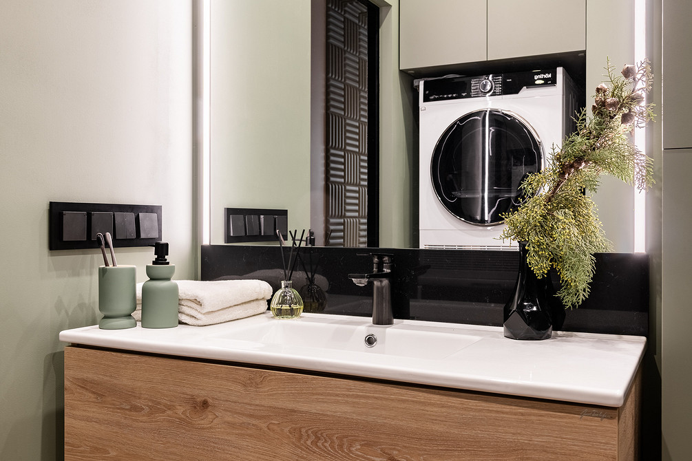 Тот же зеленый оттенок использовали в оформлении санузла: покрасили стены, потолок, в том же оттенке сделана мебель — инсталляция, шкаф над стиральной и сушильной машинами. Напротив двери в санузле поклеена декоративная фреска, которая отвлекает от утилитарной функции помещения. Стены и поддон душевой оформлены черной мозаикой.