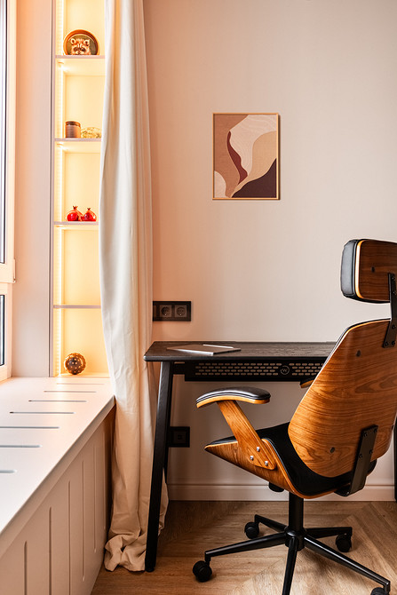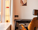 Напротив кровати расположили рабочий стол и ряд открытых полок. При желании над столом можно повесить дополнительные полки для хранения. Радиаторы закрыли декоративной панелью и сделали широкий подоконник, куда можно присесть.