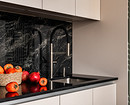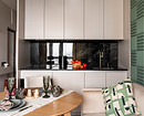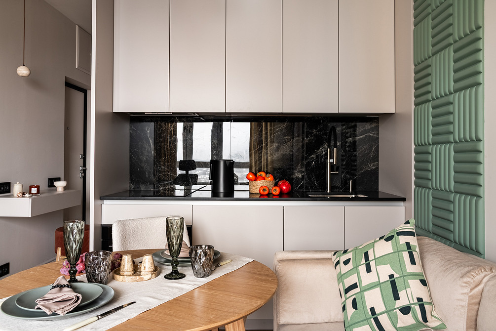 Кухня компактная, но соответствует размеру помещения и назначению — все-таки здесь будет жить не семья, а один молодой человек. Мини-холодильник встроен в нижний шкаф рядом с духовкой. В верхних шкафах до потолка предусмотрено достаточно хранения.
