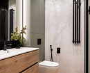 В ванной комнате предусмотрено хранение в виде тумбы под раковиной, шкафа над колонной из стиральной и сушильной машины, а также над инсталляцией унитаза.