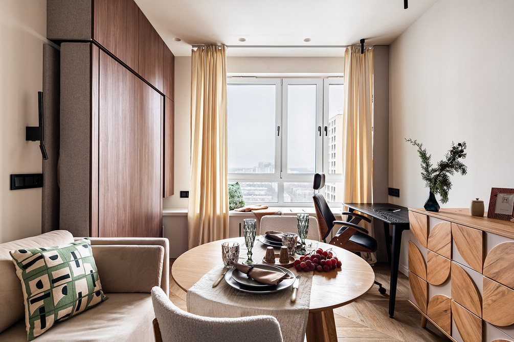 Квартира для сына-студента: функциональный и уютный интерьер студии 21 кв. м с функциями двушки