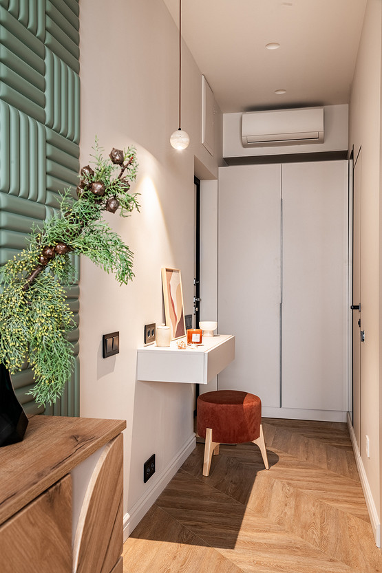 В прихожей установили шкаф для верхней одежды и обуви с антресольным хранением. Рядом с дверью — подвесная консоль с выдвижным ящиком для разных мелочей.