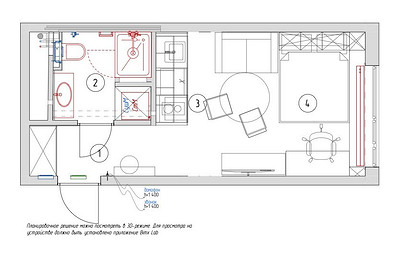 Планировку студии не меняли, так как изначальное расположение зон не предполагало вариаций: менять местами кухню и ванную нельзя, их оставили, в комнате расположили диван с телевизионной зоной напротив и кровать-шкаф у окна; напротив кровати — рабочее место.