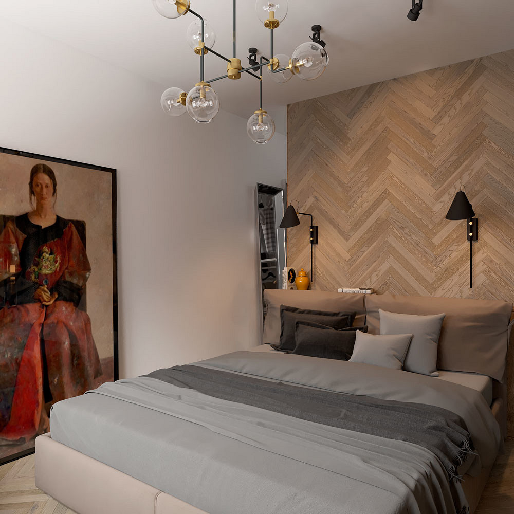 В отделке разных зон используют одинаковые материалы. Так, на пол жилых комнат положат штучный паркет. В холле и кухне его оригинально состыкуют с керамогранитом, используя вставки, повторяющие формат деревянных плашек.