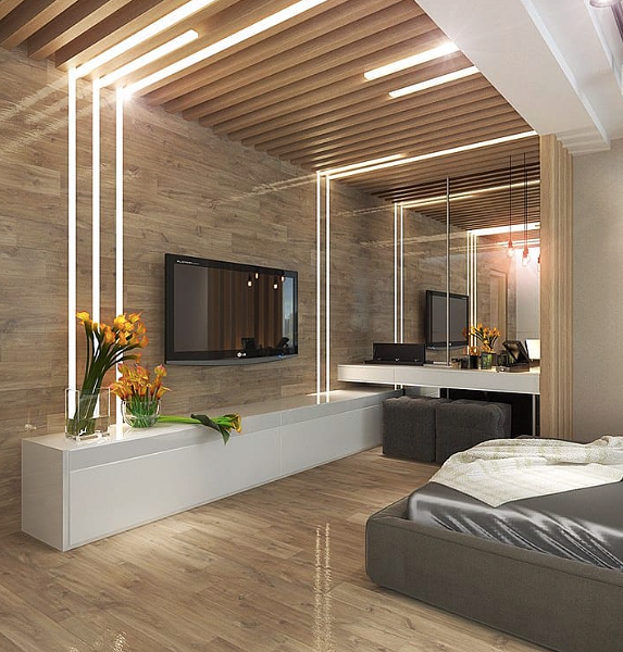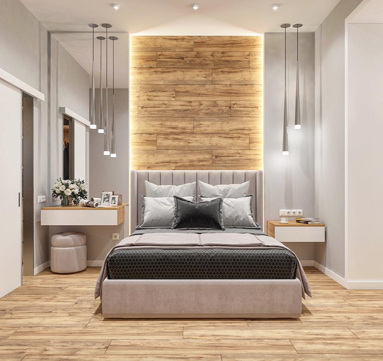 Сделать акцент в изголовье кровати — одна из лучших идей применения покрытия. Часто дизайнеры выбирают тот же вид, что и на полу, чтобы создать плавный переход и эффект увеличенного пространства. Кстати, такой прием визуально увеличивает еще и высоту потолков. Иногда выделяют не всю стену, а только части — например, по бокам от кровати или в зоне телевизора/рабочего стола/туалетного столика.Искусственный материал с древесным узором в любом случае придаст комнате уюта и теплоты — то, что нужно для спальни и комфортного отдыха.