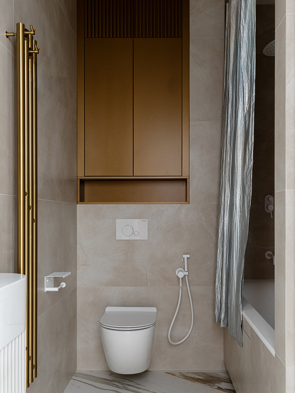 В ванной комнате — тумба под раковину с закругленными краями и шкафчик над инсталляцией. Полки для разных средств сделали скрытыми, в виде ниш, которые видны только находящемуся непосредственно в ванне. Это позволит минимизировать визуальный шум.