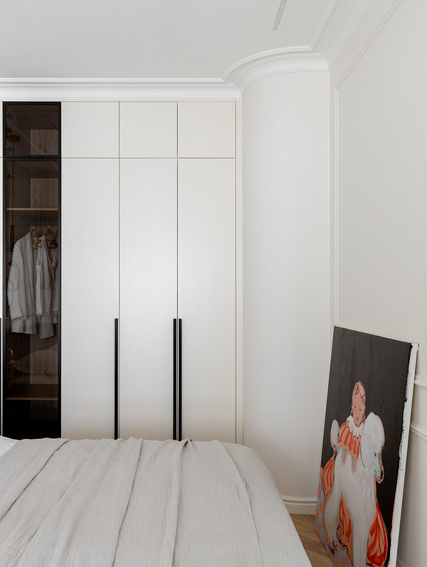Основная система хранения для вещей расположена в спальне. Это высокий встроенный шкаф. Одну секцию сделали со стеклянной дверкой, чтобы разнообразить пространство и объем.