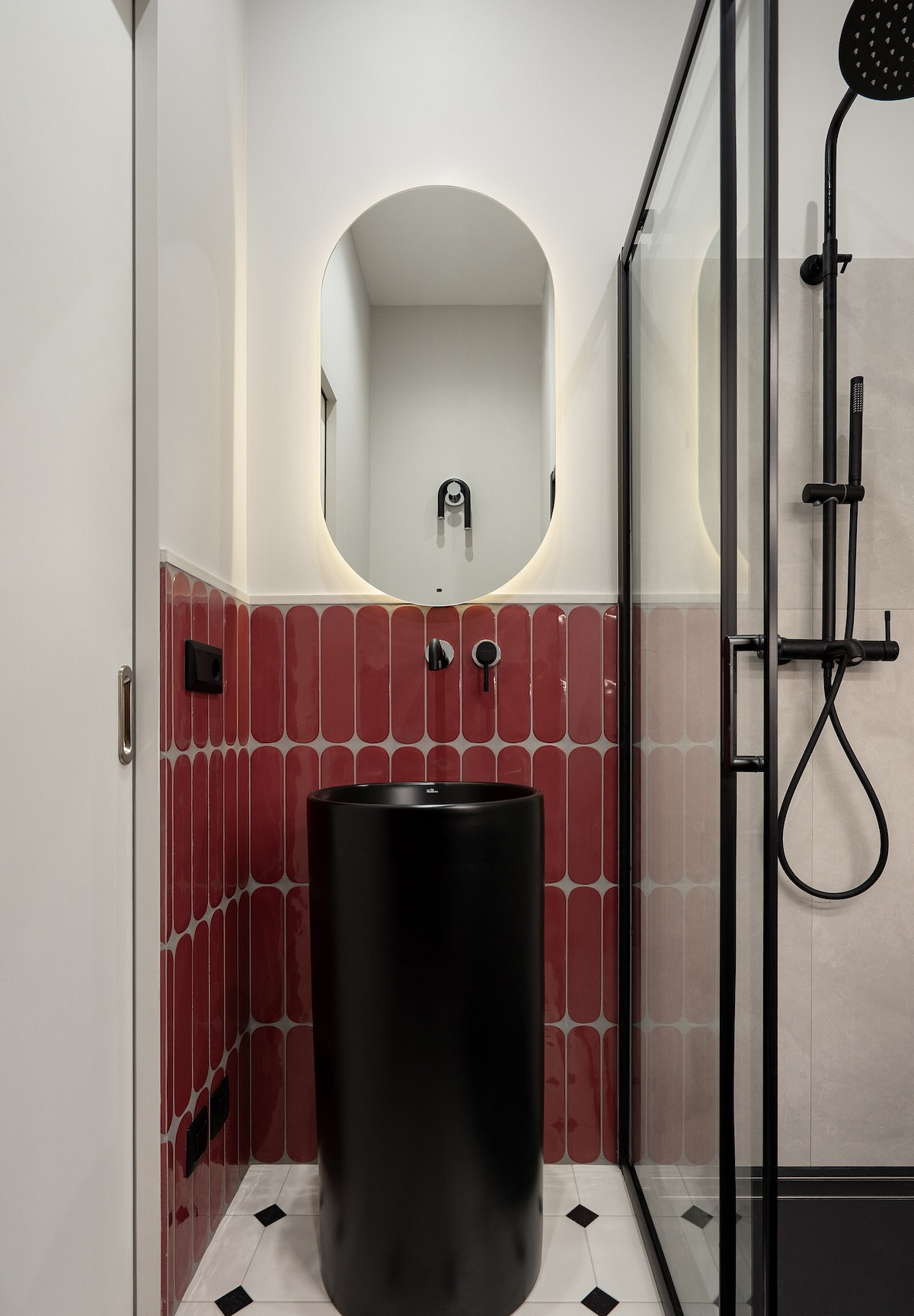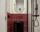 В ванной комнате хозяйки тоже разнообразная отделка: акцентная плитка бордового цвета, бежевый керамогранит в душевой, черно-белый керамогранит на полу и черный — в душевой.