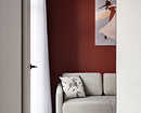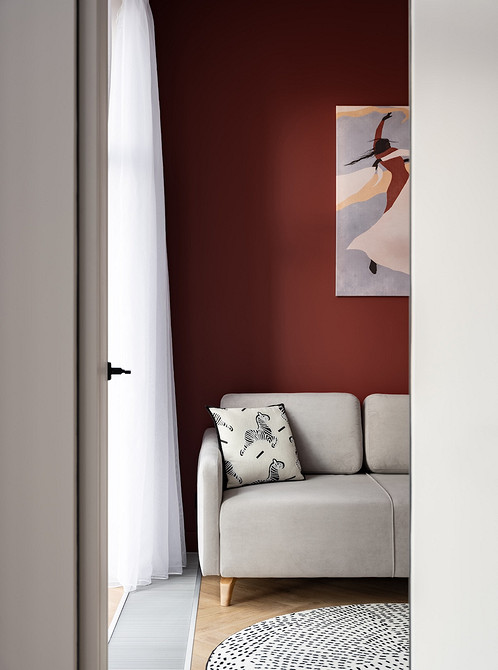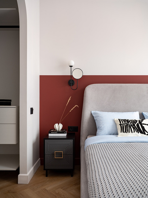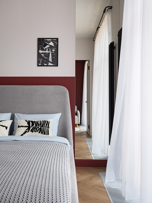 Основная отделка стен — краска. Александра выбрала светлый цвет в качестве фона и акцентные цвета: насыщенный брусничный для стены за диваном в гостиной и за кроватью в спальне, светлый голубой для верхней части стен на кухне и в прихожей. Границу между светлой краской и голубой оформили черной и белой плиткой.