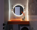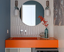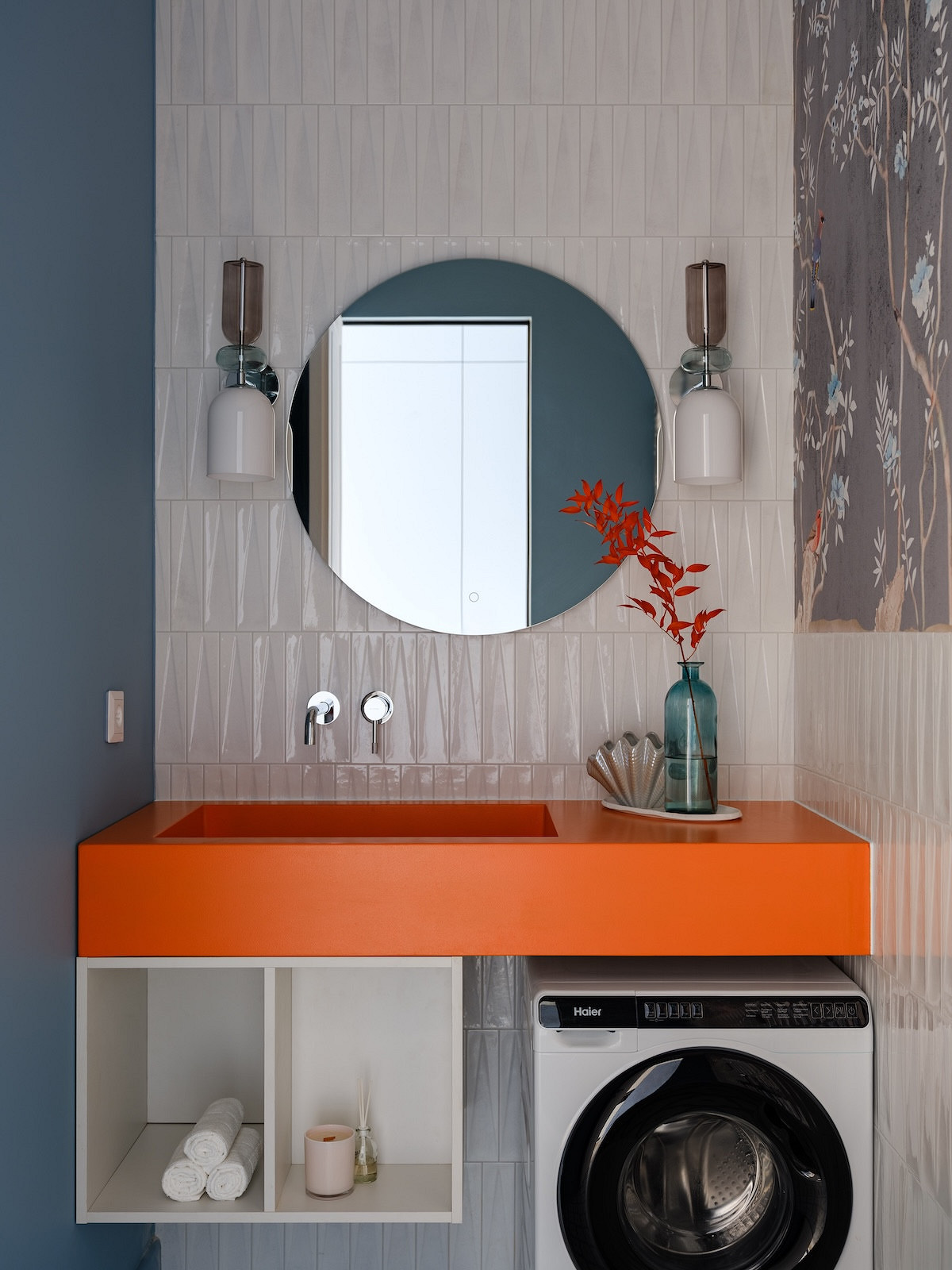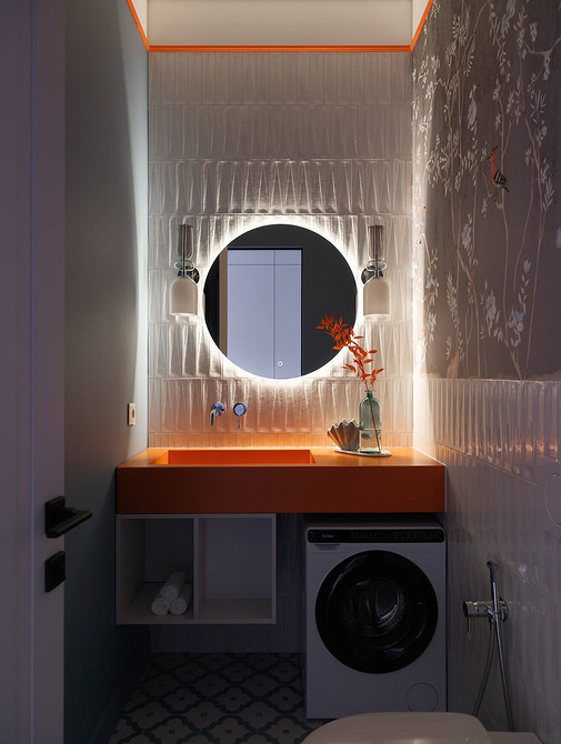 Пол в прихожей оформили плиткой в стиле пэчворк. Отделка туалета разнообразна: дизайнер выбрала обои с цветочным рисунком, белую мелкоформатную плитку для «мокрых» участков, стену с дверью покрасили голубой краской. Акцентом стала оранжевая столешница с интегрированной раковиной. В цвет столешницы выкрашен и молдинг, которым оформили границу между плиткой и краской.