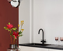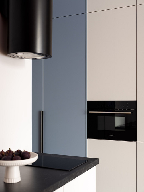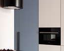 Рабочая часть кухни очень компактная — нижние шкафы, в один из которых встроена посудомойка. На столешнице — мойка и варочная поверхность на две конфорки. Вытяжку выбрали островного типа — в виде круглой черной трубы.
