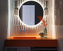 Апартаменты сдавались без перегородок. Александра разработала планировку с нуля: кухня-гостиная, туалет, спальня со своей гардеробной и ванной комнатой. «Основной изюминкой является радиальная стеная, отделяющая зону приема гостей от зоны отдыха», — отмечает дизайнер.