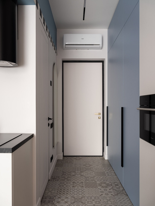 Александра продумала разные системы хранения. В прихожей — шкаф для верхней одежды и обуви, который продолжается кухонными шкафами со встроенными холодильником, духовым шкафом и полками для хранения.