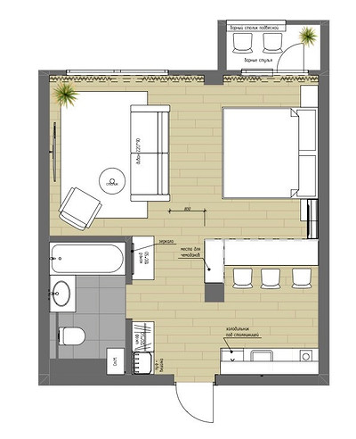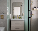 Надежда и Елена «зашли» на объект с уже готовой планировкой, которую продумали заказчики: кухня объединена в общем пространстве с жилой зоной, есть ванная и открытый балкон. Особенностью стало окно в ванной, через которое в это помещение проникает естественный свет. Жалюзи, размещенные со стороны комнаты, обеспечат полную приватность тому, кто будет принимать душ. А перегородка из тонированного стекла между унитазом и раковиной позволит не опускать жалюзи, когда гостю нужно будет воспользоваться санузлом.
