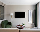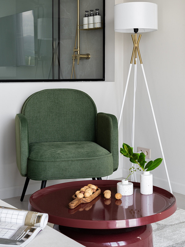 В гостиной зоне разместили раскладной диван песочного цвета с журнальным столиком в насыщенном винном оттенке и в глянцевом финише. Кресло в зеленой обивке сочетается с кроватью.