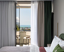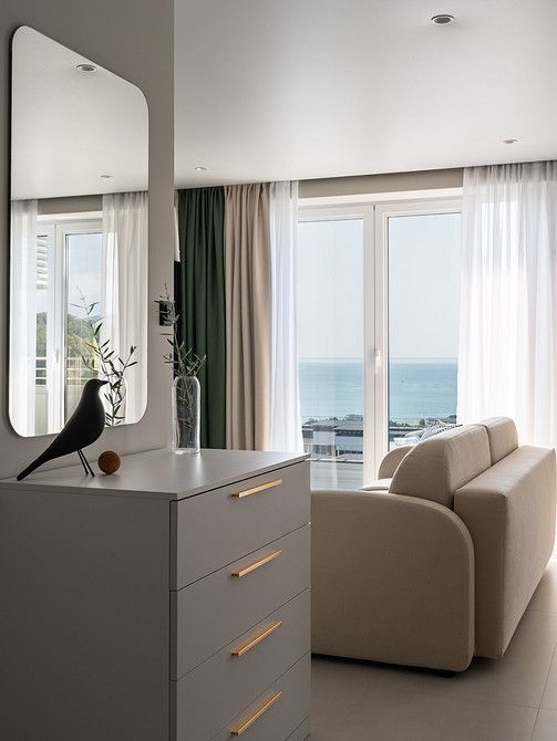 Отделочные материалы выбрали собственники: на полу в комнате и санузле светлый песочный керамогранит с «теплым» полом. «Это частый выбор для объектов, предназначенных для посуточной аренды: керамогранит устойчив к износу, легко моется и не боится влаги, песка или уличной грязи, которые неизбежны в прибрежных регионах», — комментируют декораторы. Стены покрашены в один светлый оттенок.