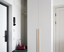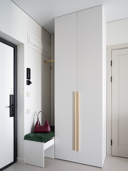 Комод, который находится на границе между прихожей и комнатой, можно использовать для хранения белья или других мелочей. Единственный шкаф расположен в прихожей. Там же — банкетка, рейл для плечиков и крючки для верхней одежды.