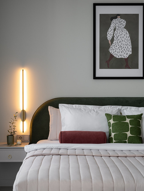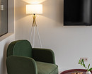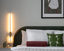 Выводы под электрику уже были запланированы, когда декораторы приступили к работе. Им нужно было подобрать светильники, соответствующие концепции проекта — спокойное пространство с выразительными акцентами. Общее потолочное освещение — минималистичные точечные светильники, встроенные в потолок. Над кухонным островом размещены акцентные подвесы с абажурами из цветного стекла под цвет кухонного фартука. У кровати предусмотрено линейное бра. В гостиной — торшер, а в ванной комнате — подсветка зеркала.