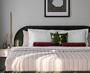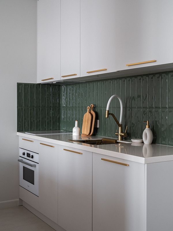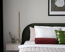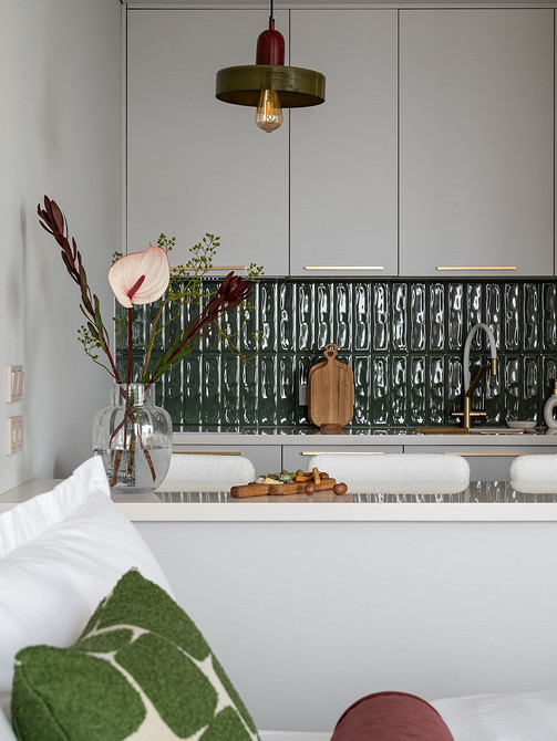 Важной просьбой хозяев было разместить в квартире кровать со спальным местом 2 х 2 метра для комфорта будущих гостей. Надежда и Елена учли это и выбрали соответствующую модель. Она с подъемным механизмом, чтобы обеспечить дополнительное хранение. Обивка зеленого цвета гармонирует с цветом плитки на фартуке. В целом, зеленый стал главным акцентом в этом светлом интерьере, что соответствует виду из окна на зелень, а также названию жилого комплекса — «Оливия».