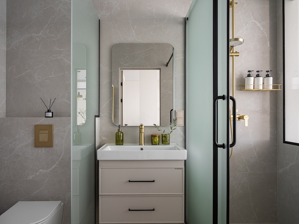В ванной комнате тоже использовали керамогранит: и для пола (он такой же, как в остальной квартире), и для стен — их оформили фактурой под серо-бежевый камень со светлыми прожилками.