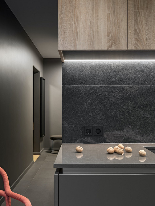 Цветовая палитра интерьера, в целом, темная, что довольно смелое решение для небольшого пространства. Глубокие тона смягчены натуральным деревом, мягкими тканями и яркими акцентами в мебели и предметах искусства. Цветные акценты намеренно запланированы «мобильными» — при желании их можно заменить, добавляя и убирая цвет.