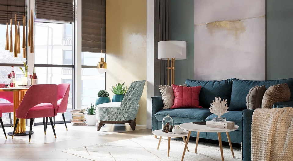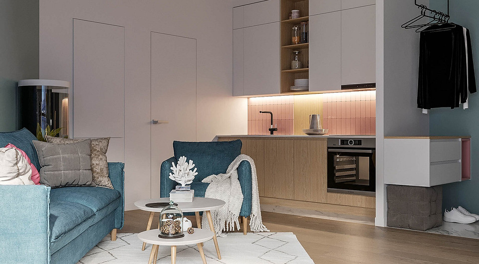 Хозяйка просила приглашённых специалистов об обустройстве в своей маленькой студии полноценной кухни-гостиной, максимально возможном обособлении спальной зоны и организации места хранения. Эстетические предпочтения заказчицы — современный интерьер с яркими деталями. Срок реализации — 6–8 месяцев.