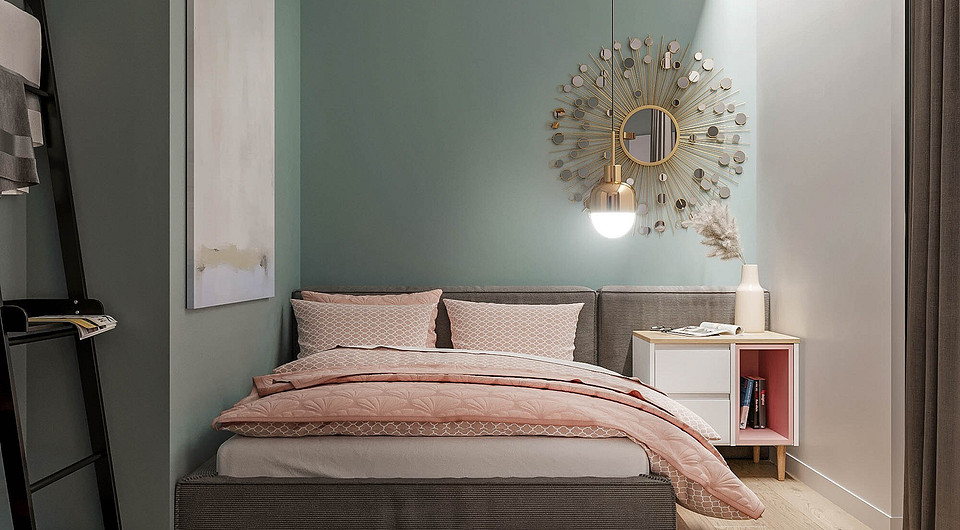 Приватная зона — мини-спальня — будет обособлена минимально, посредством вновь возводимой перегородки, частично отделяющей объём от кухни-гостиной. Отсутствие двери между помещениями разной функциональности не станет помехой для полноценного отдыха, однако поспособствует инсоляции мини-спальни.