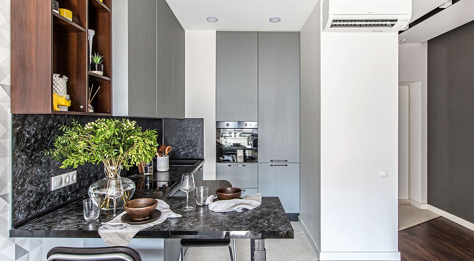 Потолки сделали подшивные, опустив высоту помещений на 15 см, — за гипсокартонную конструкцию спрятали всю подводку к кондиционерам.