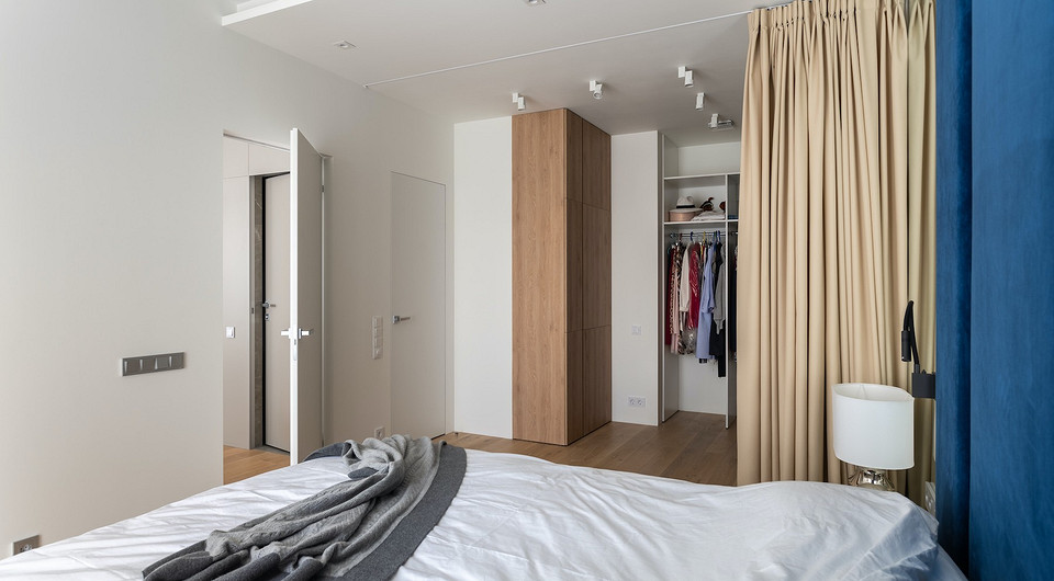 Интерьер оформлен в светлых тонах, достаточно нейтральных. Основной цвет стен можно описать как «условно белый». В спальне сделан акцент в изголовье — темно-синие велюровые панели обволакивают и создают эффект погружения. Дизайнер сравнивает их с темным ночным небом.
