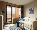 Стену с дверью на лоджию оформили панелями под дерево — такой выбор сделали, чтобы визуально «скрыть» систему хранения, выполненную из того же материала. Радиатор под окном закрыли декоративной решеткой и сделали широкий подоконник.