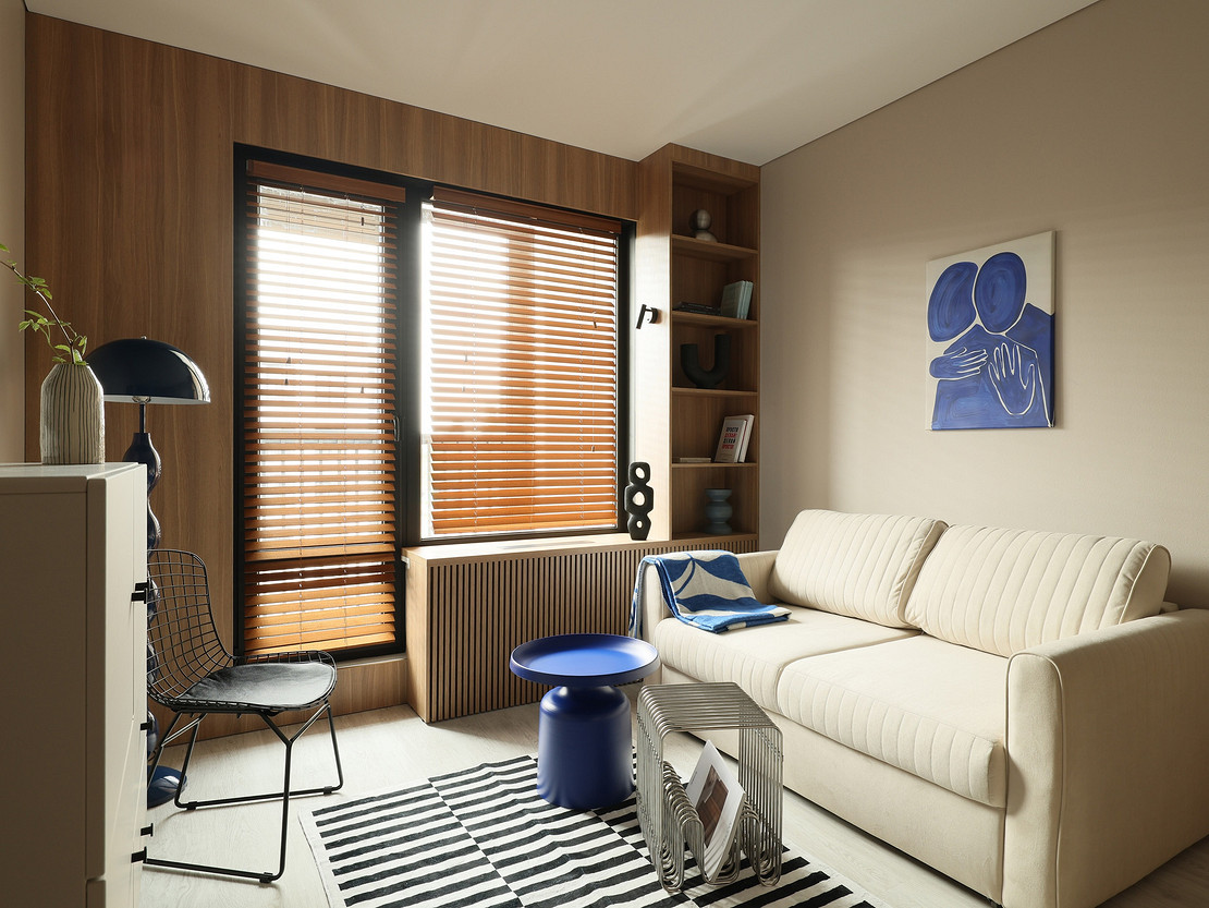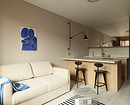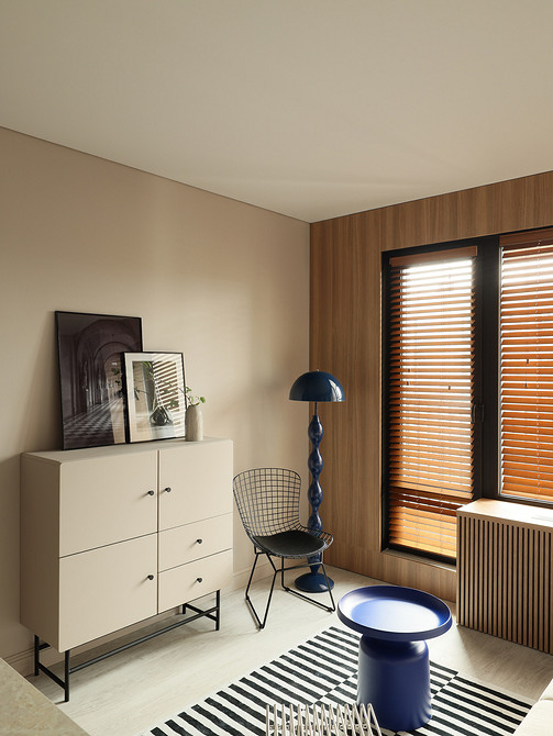 Отделку от застройщика сохранили: стены под покраску, ламинат на полу, плитка в ванной комнате. Для оформления стен выбрали бежевую краску теплого оттенка. В прихожей одну стену сделали синей — синие оттенки стали акцентными в мелкой мебели и декоре и в комнате. Плитку в ванной комнате тоже покрасили.