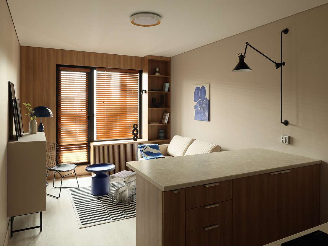 Это инвестиционный проект — маленькую студию планировали для сдачи в аренду студенту или молодой паре без детей. К дизайнерам Дарине Шайденко и Юлии Талиповой обратились с запросом на преображение интерьера с ремонтом от застройщика: требовалось провести косметический ремонт, продумать расстановку мебели и систем хранения, предусмотреть места для учебы или удаленной работы.