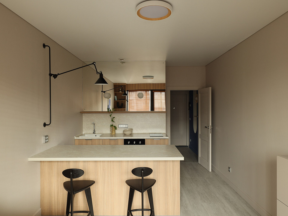 В комнате для акцента использовали несколько материалов: на кухне разместили зеркало вместо ряда верхних шкафов. Этот прием не только увеличивает пространство визуально, но и создает эффект второго окна: сидя за барной стойкой, будущие жильцы смогут наблюдать за происходящим в этом «окне».
