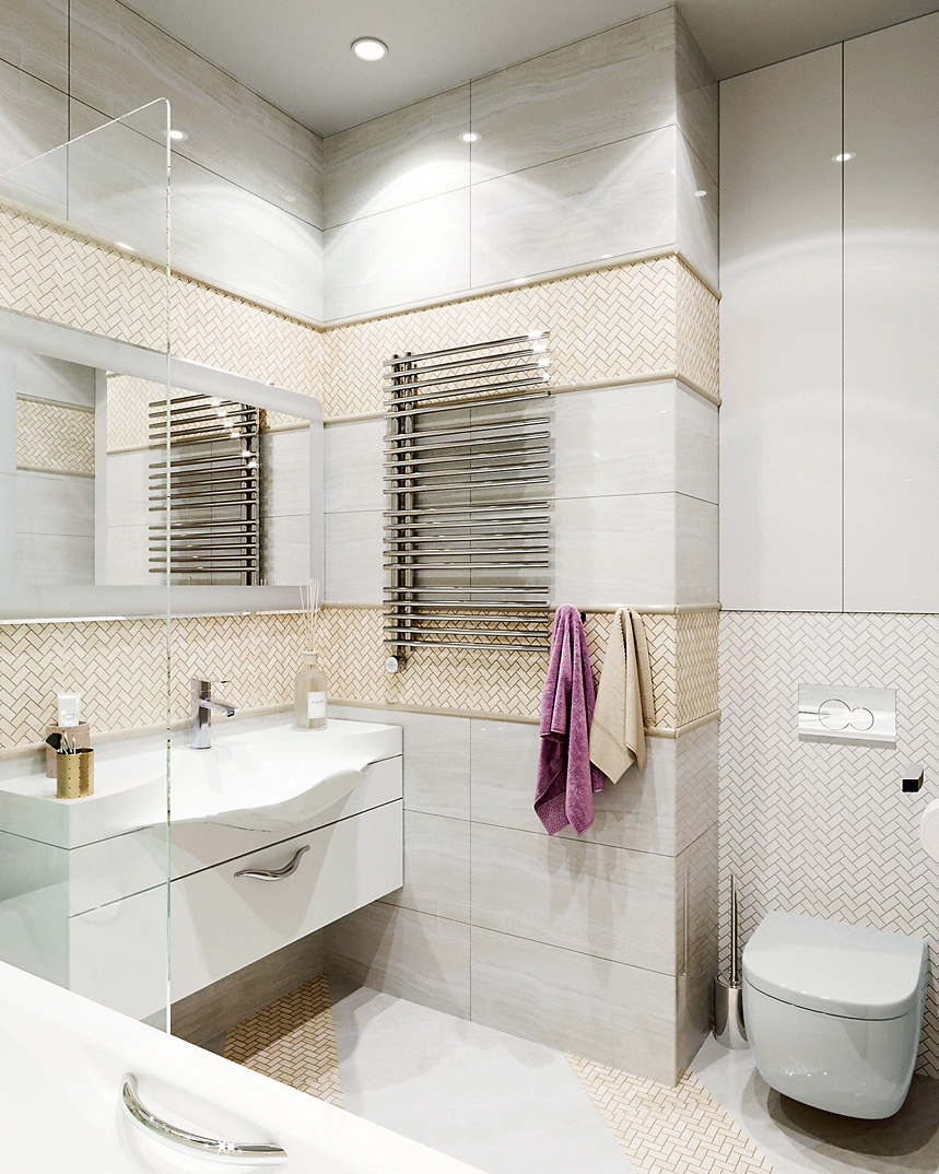 Диагональная укладка двух разнородных напольных покрытий — крупноформатного керамогранита и мелкоразмерной мозаики — станет сбивать с толку «зрителя», отвлекая его от малого размера помещения. Аналогичную схему монтажа, но уже ламината, предлагается реализовать и в остальных объёмах.