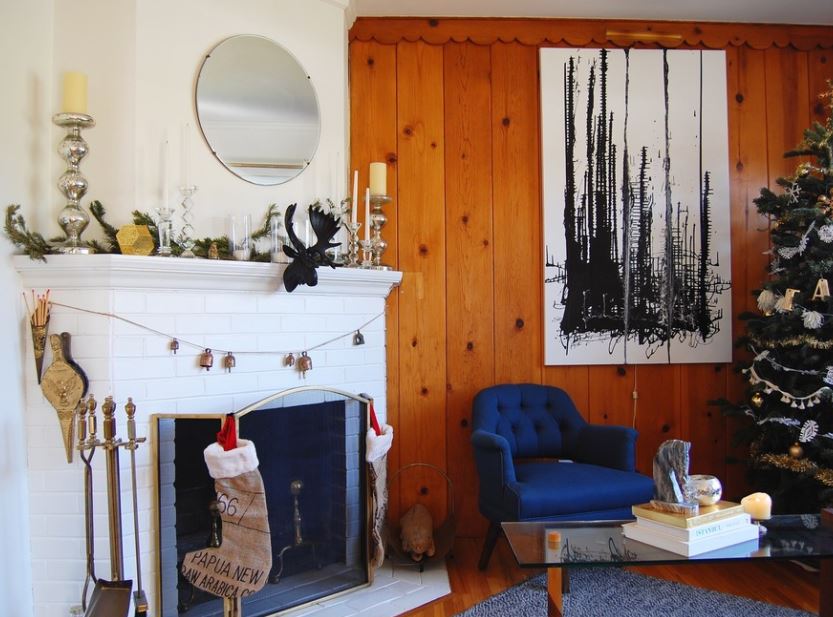 А здесь хозяева дома очень красиво украсили камин простой гирляндой с колокольчиками — и красиво, и Санту будет слышно, когда он придет с подарками. Берите на заметку.