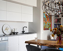 На кухне — достаточно компактный гарнитур, но со всем необходимым. Хозяйка отказалась от посудомоечной машины, так как не пользуется ей, и на кухне встроили стиральную машину. В ванной комнате ей не хотелось устанавливать ее — слишком утилитарно, а на кухне она получилась скрытой. Стеллаж для книг расположен за диваном. Для мелочей также есть консоли: в прихожей и в спальне.