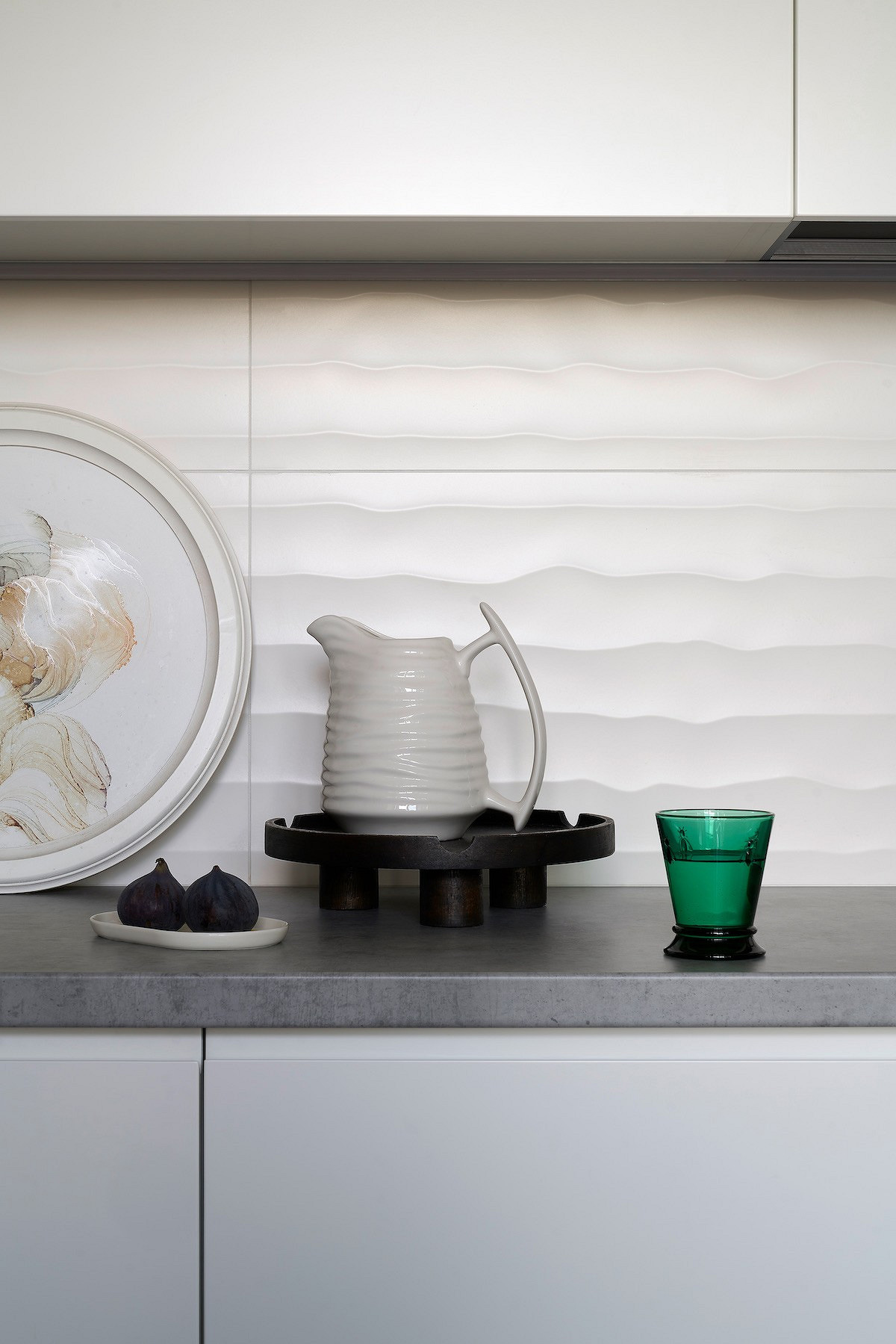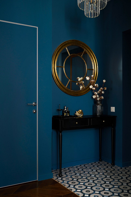 На полу во всех зонах, кроме прихожей и ванной комнаты, уложили паркет «французская елка». В прихожей — плитка с геометрическим рисунком в синих оттенках. В ванной использовали разные виды плитки. На стенах — керамогранит под камень, на полу — рифленый керамогранит. Акцентная стена выложена рельефной синей плиткой (синий цвет так или иначе появляется в интерьере всей квартиры).