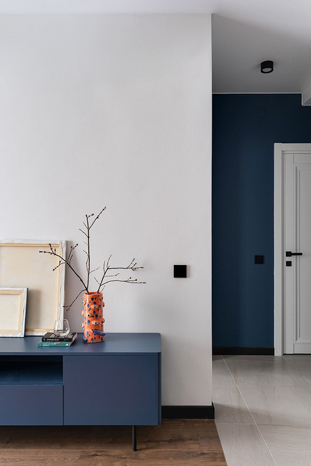 От застройщика в квартире были обои под покраску, ламинат в гостиной и спальне и напольная плитка на кухне и в прихожей. Ванная комната тоже отделана плиткой. Отделку сохранили. Выбрали светлую краску для гостиной, светло-серую — для спальни, и глубокий синий цвет — для прихожей. В гостиной за диваном использовали МДФ-панели для декора. На фартук уложили яркую оранжевую плитку, которую поддержали декором и цветом ковра (его выбирал заказчик сам уже после ремонта, советуясь с дизайнером).