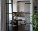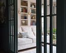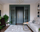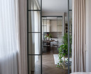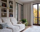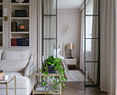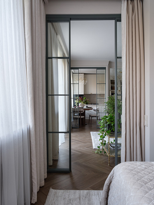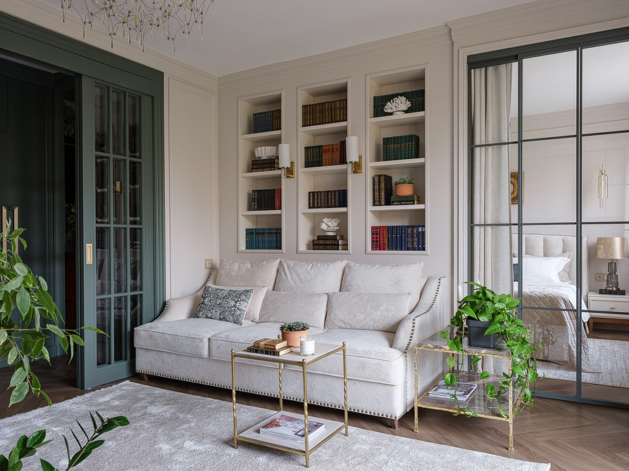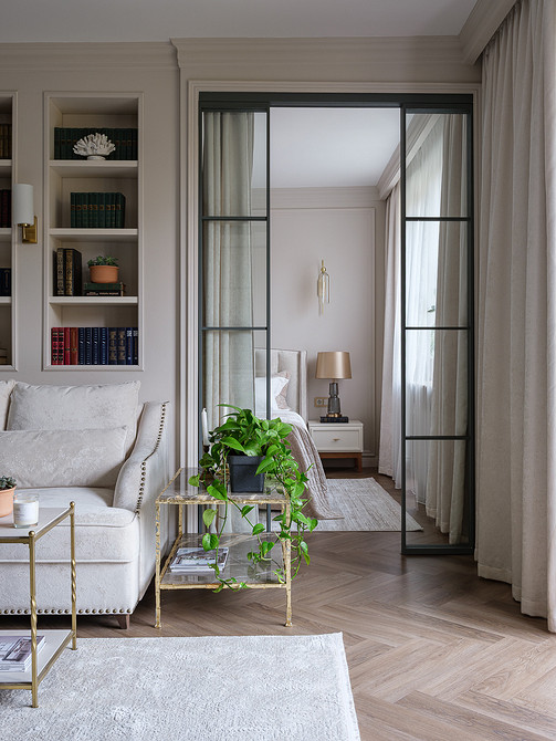 В изначальную планировку внесли изменения. Так, перестроили перегородку между гостиной и спальней, чтобы сделать встроенные стеллажи для книг и вход в спальню из гостиной через стеклянные высокие двери. Также перенесли вход на кухню в гостиную, а за счет коридора, где раньше была дверь на кухню, увеличили ванную комнату. Еще одно изменение коснулось большой комнаты. Ее уменьшили, чтобы выделить гардеробную. И организовали гостевую-кабинет.