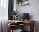 Одно из красивых решений — окрашенные карнизы и плинтусы. В прихожей, спальне и гостиной они окрашены в цвет стен, в кабинете — в контрастный к цвету обоев зеленый, но повторяющий цвет стен в прихожей и цвет межкомнатной двери.