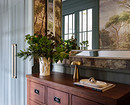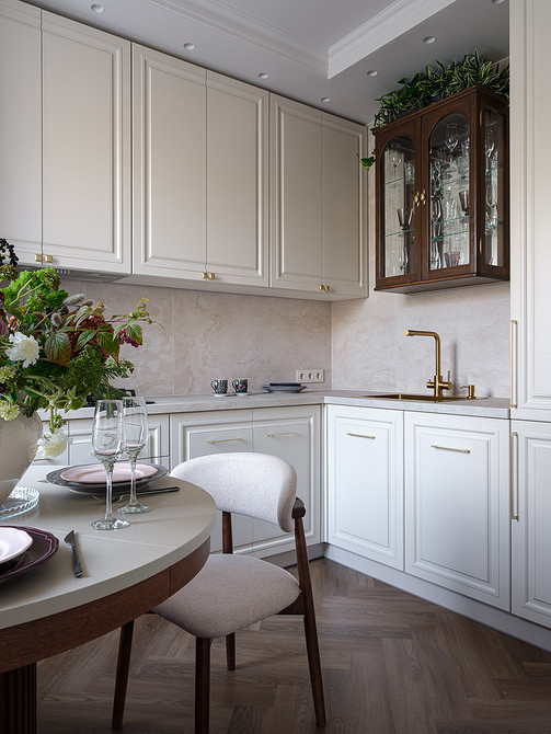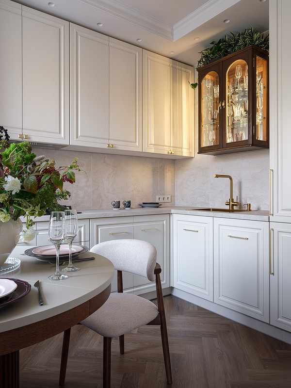 На кухне разместили шкафы Г-образно, технику встроили в колонны (холодильник, духовой шкаф и СВЧ), в нижние шкафы — посудомоечную машину. Над мойкой разместили красивый антикварный буфет вместо ряда верхних шкафов, что добавило пространству своего шарма. Антикварные комоды также есть в гостиной (вместо тумбы под телевизор), в прихожей и кабинете.